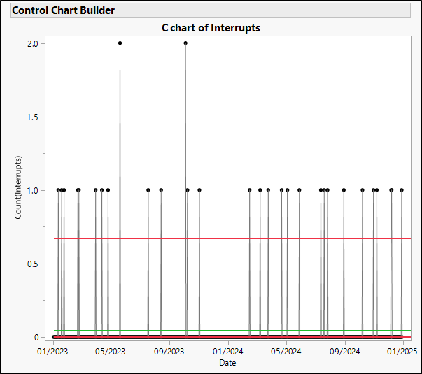 Every instance of an interrupt is also an out-of-control point. The C chart is not helpful for monitoring the process. There are two control charts designed to monitor rare events.