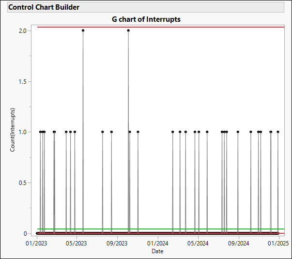 The G control chart uses 3$\sigma$ limits based on a negative binomial distribution instead of a Poisson distribution. The negative binomial distribution is similar to the Poisson, but includes an extra parameter to allow for overdispersion, that is, allowing the variance to be bigger than the mean. The G chart on the interrupts data shows no signals.