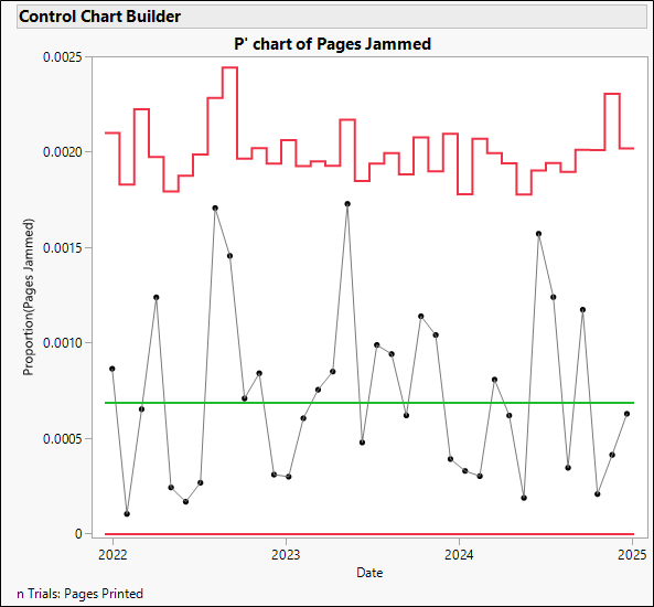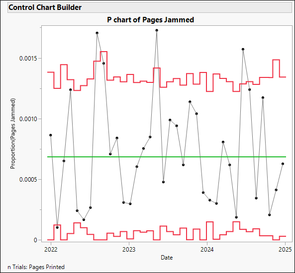 Let’s look at an example. Suppose you count the number of printer jams that occur each month. You use a P chart to control the proportion of pages jammed out of the total number of pages printed each month.
