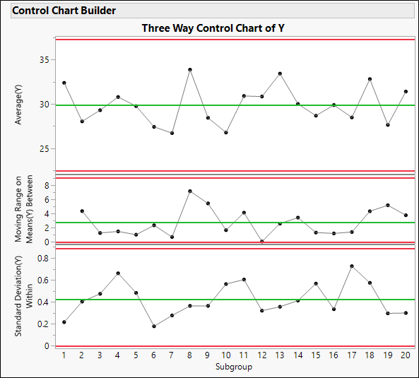 An appropriate estimate of between-subgroup variation comes from the variation of the subgroup means themselves, that is, the moving range of subgroup means. Note that this method is the same as using an individuals control chart on the subgroup means. An appropriate chart to control the batch process is the three-way chart (see below). The first chart plots the subgroup averages with limits calculated from the moving range of the subgroup averages. The second chart plots the moving range of the subgroup averages on an MR chart. The third chart plots the subgroup standard deviation (or range) on an S (or R) chart.