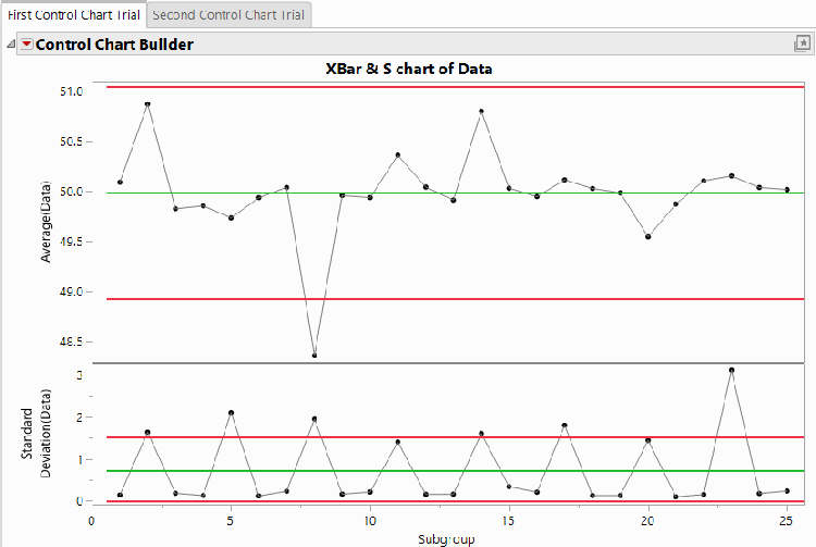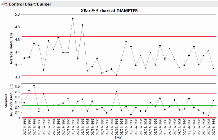 The generally accepted method for using an Xbar-S chart is first to verify that the S chart shows points in control, then to use the average chart to look for process problems. If the S chart exhibits many out-of-control points, particularly those not corresponding to an out-of-control point in the average chart, then the process is not stable enough to use control charting. In these cases, focus first on removing sources of variation from the process, then start the charting process again.