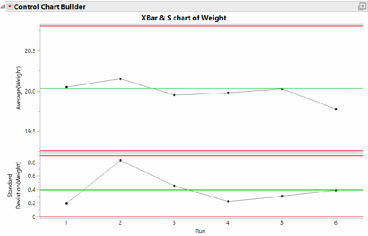 The company Red Triangle Widgets measures and records the weight of every widget made from an injection molding process. The mold has four cavities, all of which experience the same conditions each time the machine runs. Red Triangle Widgets keeps track of the run number associated with each batch of four widgets and uses this run number plus the measurements themselves to make the Xbar-S chart shown below.