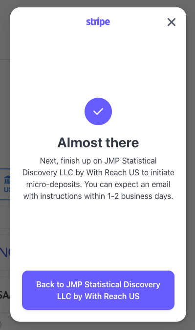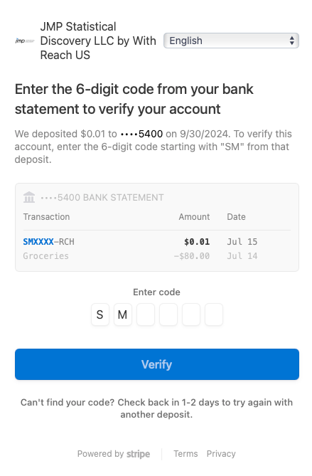 Within 1–2 business days, check your bank statement for a $0.01 micro-deposit. The deposit will include a 6-digit code (starting with "SM") in the comments section.