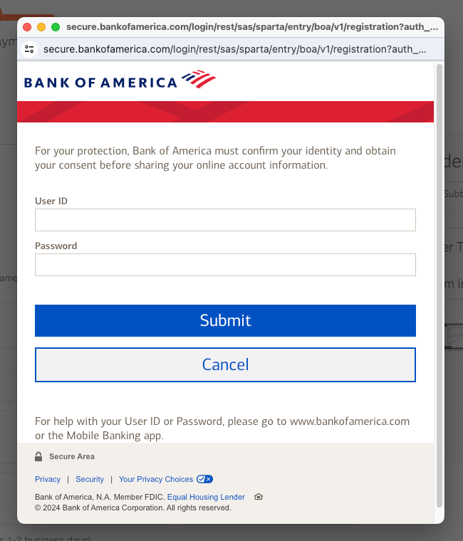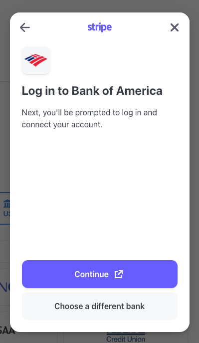 Select "Continue" to confirm that you're connecting to the correct bank (e.g., Bank of America).