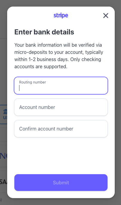 Please note that some business bank accounts may have filters in place to deny debits from unknown entities. To allow our payment provider Stripe to debit from your account on our behalf, Stripe's ACH company IDs might need to be provided to your bank to ensure ACH transactions will be processed.