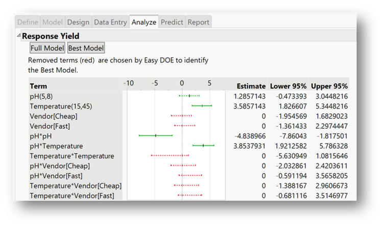 Durante el paso de analizar, el modelo estadístico inicial "completo" especificado se ajusta a los datos experimentales. Cuando se realiza el cribado, el modelo consta de efectos principales, o a veces algunas o todas las interacciones de dos factores. Cuando quiere predecir o optimizar el proceso, el modelo típicamente incluye efectos de segundo orden (interacciones de dos factores y cuadráticas). Un modelo estadístico común es un modelo de regresión lineal múltiple. Los efectos inactivos (no significativos) se pueden eliminar del modelo completo inicial para crear un modelo reducido. Si se recopila más de una respuesta durante el experimento, se ajusta un modelo individual para cada respuesta.