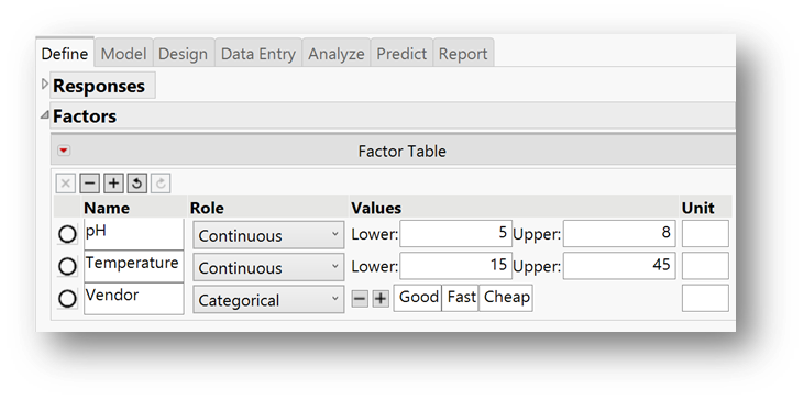 El flujo de trabajo del DOE consta de seis pasos: definir, modelar, ingresar datos, analizar y predecir. El marco para diseñar un experimento sigue siendo el mismo independientemente del método de diseño experimental que elija.