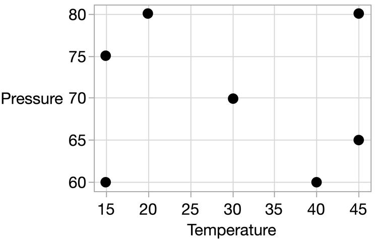 Usando software DOE, como JMP, usted crea un diseño de 15 ejecuciones sin ejecuciones en las esquinas inviables del espacio factorial. El software indica que el diseño requerirá un mínimo de 11 ejecuciones, lo cual es necesario para estimar la constante del modelo y los efectos principales de siete factores continuos, un factor categórico de tres niveles y un factor categórico de dos niveles. (Tenga en cuenta que un factor de K-nivel requiere estimar K-1 parámetros del modelo.) Todavía le quedan cuatro ejecuciones en su presupuesto, por lo que especifica que el algoritmo debe producir un diseño con dos puntos centrales y dos ejecuciones replicadas. Juntas, le ayudarán a evaluar si todos los efectos continuos presentan una curvatura cuadrática. (Veremos esto más a fondo cuando hagamos el análisis de los datos.) La tabla de diseño está a continuación, seguida de un gráfico que muestra el diseño en el espacio de Presión por Temperatura .