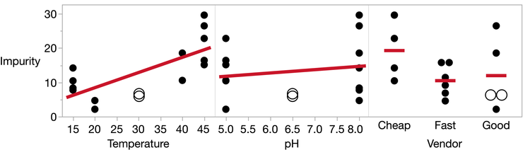 Luego, hace un gráfico para entender la naturaleza de los efectos que ha descubierto. El gráfico muestra que los efectos de Temperatura y pH son positivos, siendo el efecto de Temperatura más grande a lo largo de su rango. También se observa un patrón claro en el efecto del Proveedor; el Económico tiene un nivel de impurezas notablemente más alto que el Rápido o Bueno. También nota que los dos puntos centrales (mostrados como círculos abiertos) están muy por debajo de las líneas que trazan los efectos de la Temperatura y el pH. Esto sugiere una curvatura cuadrática en al menos un efecto continuo, aunque con puntos centrales, no se puede identificar qué factor es responsable.