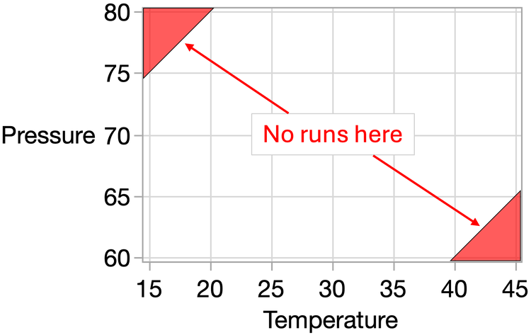 Al diseñar este experimento, se enfrentan dos complicaciones. Primero, las limitaciones de recursos le limitan a 15 ejecuciones, que pueden cubrir menos del 2% de las 768 esquinas del espacio factorial. Con este diseño disperso, necesita evaluar el efecto principal de cada factor, así como la posibilidad de curvatura cuadrática en los efectos de uno o más de los factores continuos, requiriendo al menos un punto central (es decir, una ejecución en el valor medio de todos los factores continuos). En segundo lugar, sabe que no es factible operar a alta presión mientras se mantiene una baja temperatura y viceversa, por lo que necesita restringir el diseño para evitar ejecuciones en estas áreas del espacio factorial. Esta restricción se representa gráficamente a continuación, donde las regiones rojas indican áreas del espacio factorial que se deben evitar.