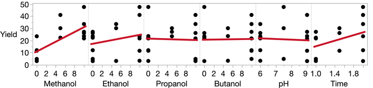 Visualizar el efecto principal de cada factor muestra que el Metanol y el Tiempo tienen fuertes efectos positivos sobre el Rendimiento, mientras que el Etanol también tiene un efecto positivo menor. Las líneas de Propanol, Butanol y pH parecen sin cambios, lo que sugiere efectos principales insignificantes para estos factores. Un modelo de regresión múltiple de solo efectos principales confirma que los efectos principales de Metanol, Etanol y Tiempo están activos, y debido a que utilizó un DSD, sabe que las estimaciones de los efectos principales no están sesgadas por ninguna de las interacciones de dos factores activos que aún no ha investigado. Elige moverse hacia delante con Metanol, Etanol y Tiempo como sus factores activos.