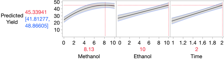 Debido a que utilizó un DSD de seis factores e identificó solo tres factores activos, puede ajustar un modelo cuadrático completo sin agregar más ejecuciones al diseño. Utiliza la regresión múltiple con un método de selección de variables para llegar a un modelo final que se utilizará para la optimización. Ese modelo revela que el efecto de Metanol exhibe curvatura cuadrática y que Etanol y Tiempo exhiben una interacción de dos factores: Etanol ejerce un efecto insignificante cuando el Tiempo es bajo, pero un efecto fuerte cuando el Tiempo es alto.