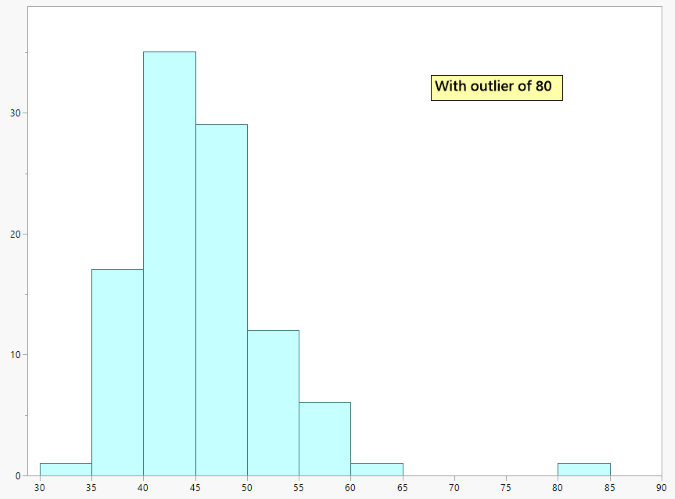 Les distributions ci-dessous montrent un jeu de données avec une valeur aberrante exclue (Figure 2), puis avec la valeur aberrante inclue (Figure 3).