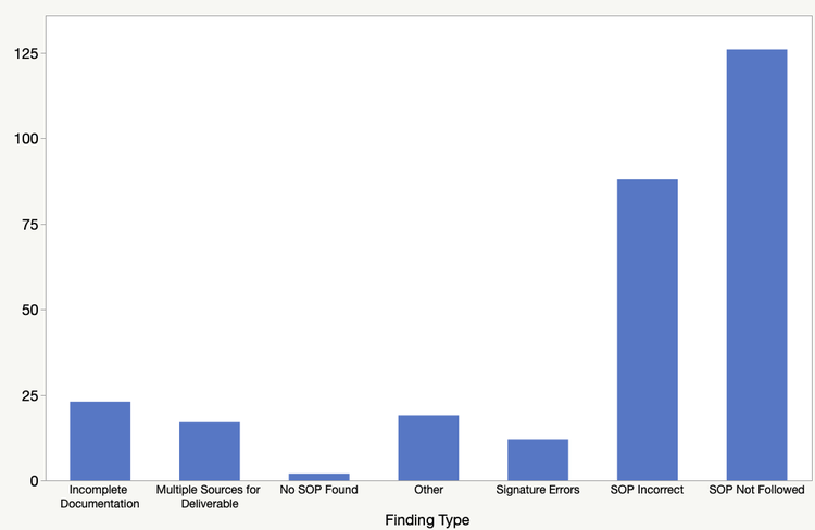 Il grafico mostra i tipi di elementi rilevati durante l'audit di processi aziendali. L'elemento più comune è la mancata esecuzione di una procedura operativa standard (SOP).