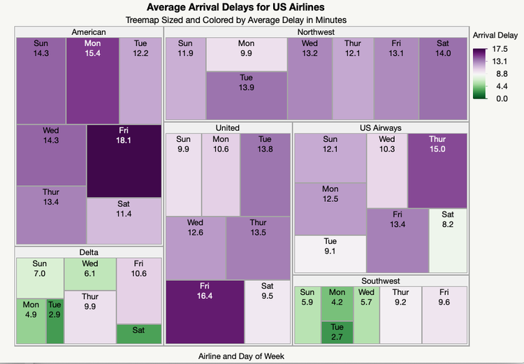 Per tutte le compagnie aeree, il ritardo medio degli arrivi varia nei diversi giorni della settimana. Se vogliamo scegliere la compagnia aerea che ha in generale i ritardi minori, la mappa ad albero mostra che dovremmo optare per Southwest o Delta. Il ritardo medio di queste due compagnie è inferiore a otto minuti a inizio settimana e aumenta il giovedì e il venerdì. Il maggior ritardo medio è invece inferiore a 11 minuti. Al contrario, per American Airlines è il minor ritardo medio a essere di 11 minuti. Il minor ritardo medio dell'intera mappa ad albero è quello della Southwest Airlines del martedì. Il maggior ritardo medio è invece quello della American Airlines del venerdì.