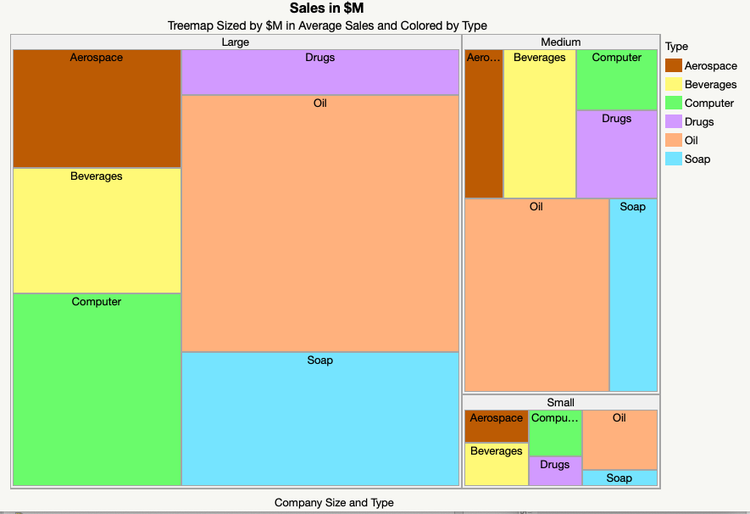 Le mappe ad albero sono particolarmente utili nel caso di set di variabili più ampi, con livelli multipli. La Figura 3 mostra dati finanziari simili a quelli presentati in Figura 2. In questo caso, la variabile relativa ai diversi tipi di aziende ha ben sei livelli. Inoltre, c'è una variabile relativa alle dimensioni delle aziende. In questo esempio, quindi, le categorie di aziende sono più numerose che negli esempi precedenti. Le dimensioni dei rettangoli dipendono dalla media delle vendite in dollari USA. Inoltre, i rettangoli sono colorati a seconda del tipo di azienda e raggruppati in base alle dimensioni dell'azienda.