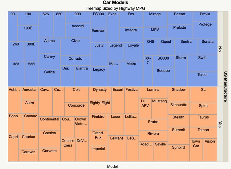 Gli esempi precedenti erano relativi alle categorie, o gerarchie, sull'asse x. La Figura 5 mostra la gerarchia di categorie sull'asse y. I dati riguardano auto della metà degli anni '90 e le dimensioni dei riquadri della mappa ad albero dipendono dalle miglia autostradali per gallone (MPG) dei diversi modelli. La variabile sull'asse y indica se l'auto è stata prodotta negli Stati Uniti.