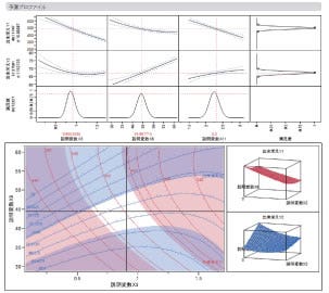 赤間氏は、個人的に新たなツールを調査し、JMPを評価してみることにした。中でも、カスタム計画や満足度の最大化手法こそ、欲しかった機能だったとい う。カスタム計画を使えば、JMPが提供する実験計画のメニューのひとつで、実験数の指定や実験範囲の制約の指定を可能にするなど、現場の状況に合わせて 柔軟に計画を作成できる。また、実験結果の解析では、満足度の最大化手法にて複数の目的変数の制約条件に対する最適解を求めることができる。「カスタム計 画機能によってユーザの目的に合わせて実験計画を自由に作成できるので、タグチメソッドなどの既成の実験計画を進化させることもできます。また実際には、 それぞれ異なる目的変数が複数存在し、説明変数の積項(交互作用)や二乗項が影響していることも多い。これに対して満足度の最大化手法で最適解を一発で算 出し、さらにシミュレータにてロバスト性を検証できることがわかりました」(赤間氏)。