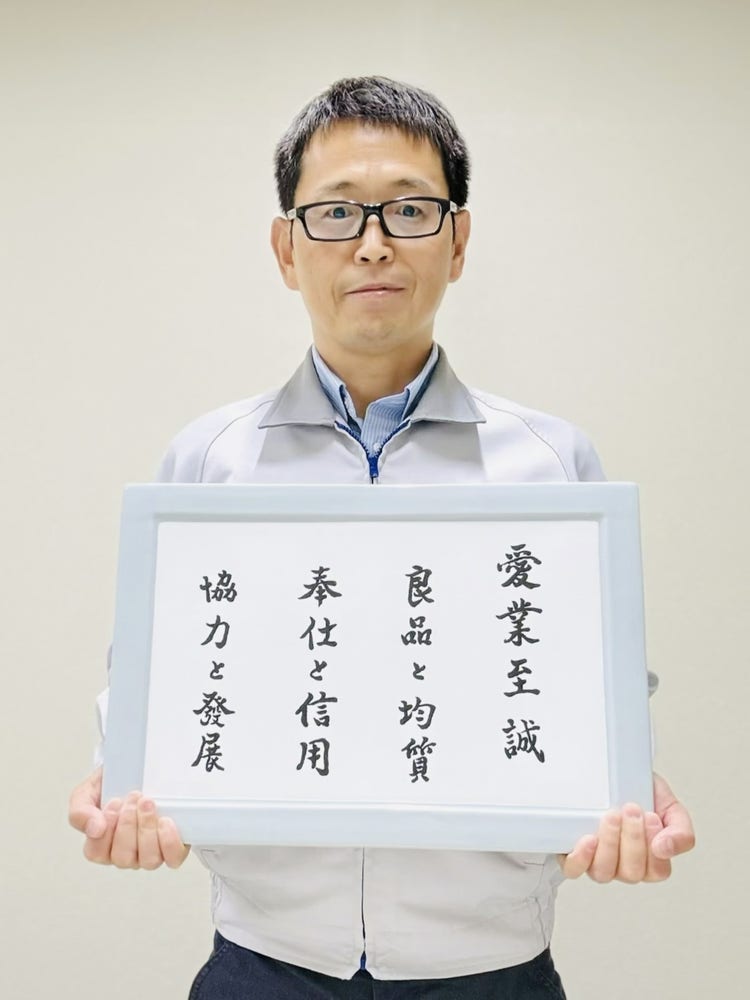 上田 忠雄 氏(社是が記された陶板を手に)