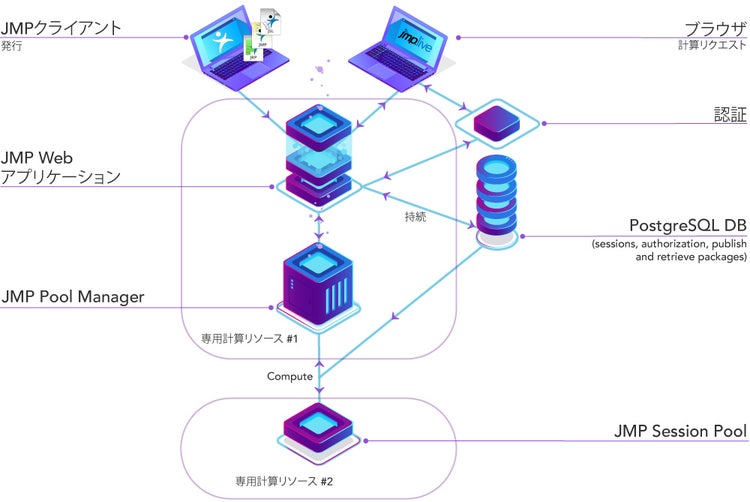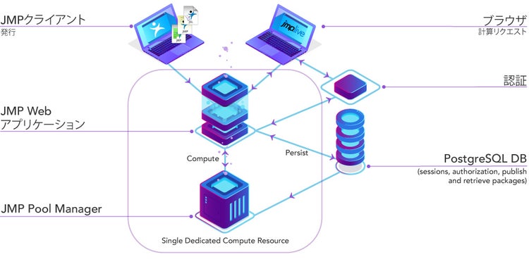 データをどこに保存し、どのようにアクセスするかにかかわらず、フレームワークにJMP Liveを統合できます。JMP Liveは、オンプレミスで現在使用しているデータ・インフラストラクチャーにインストールすることもできますし、パブリッククラウド(Amazon Web Services、Microsoft Azure、Google Cloud、またはOpenStack)を利用することもできます。
