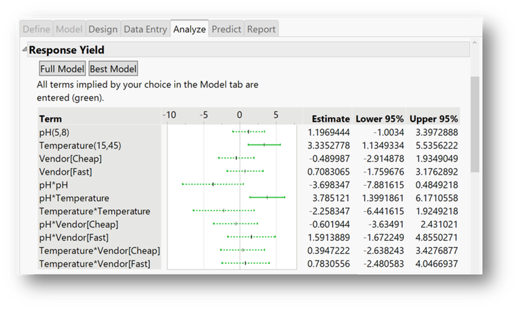 解析ステップでは、最初に指定された「完全な」統計モデルを実験データにあてはめます。スクリーニングでは、モデルは主効果で構成されますが、2因子交互作用の一部またはすべてで構成されることもあります。工程を予測または最適化する際、モデルには通常、2次効果(因子間の交互作用や2乗項)が含まれます。一般的な統計モデルとしては、多重線形回帰モデルがあります。影響のない(有意でない)効果は、初期の全効果のモデルから削除して、縮小モデルを作成できます。実験中に複数の応答が収集された場合、各応答に対して個別のモデルがあてはめられます。
