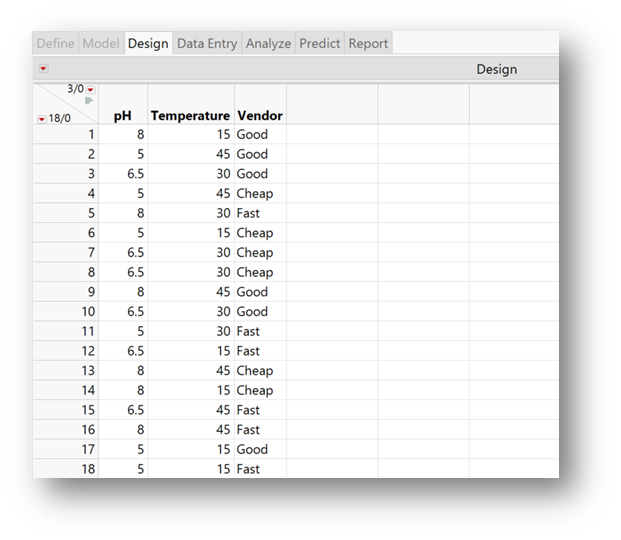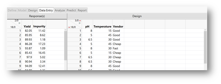 データ入力のステップでは、実験の順序に従って実験し、各実験の応答がデータテーブルに記録されます。