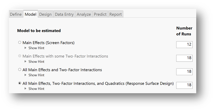 モデルステップでは、初期統計モデルを指定します。計画された実験とは、提案された統計モデルを支持するために実施される試行の集合です。指定した統計モデルは、実験の目的に直接関連しています。1次モデル(主効果のみ)は、重要な因子の特定(スクリーニング)に一般的に使用されますが、2次モデル(交互作用項および2乗項を含む)は、応答の予測と最適化においてより高い柔軟性を提供します。使用する計画アプローチによって、統計モデルは計画の設定に暗黙的に含まれるか、推定したいモデル効果のみを含む統計モデルを指定することができます。