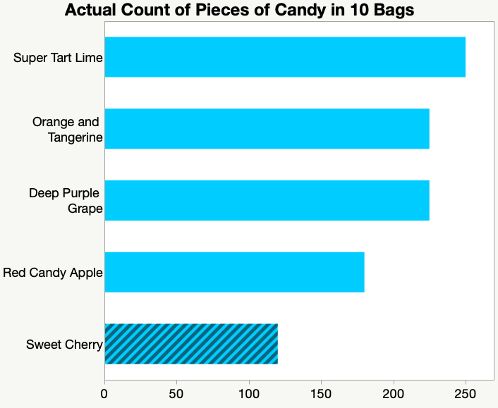 一方で、キャンディ会社は、すべての袋に各フレーバーが少なくとも18個含まれることを求めている、と仮定します。10個の袋全体では、各フレーバーが少なくとも180個必要です。データにはチェリーが120個しかないので、この問題を強調しようと思います。図6では、これを強調するために影付きの棒を使用しています。別のオプションは、チェリーの棒を強調するために別の色を使用することです。