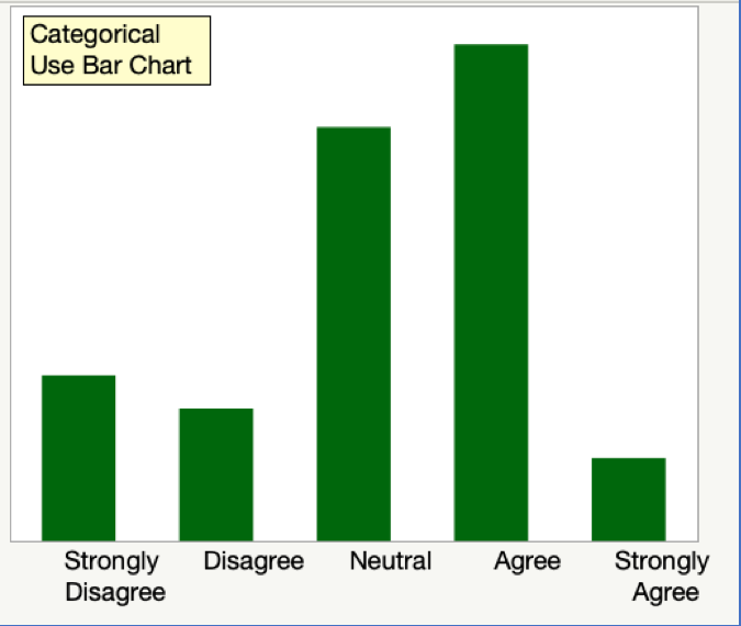 棒グラフは、カテゴリカル変数または名義尺度変数の、さまざまな水準の値の頻度数を示します。棒グラフには、割合などの他の統計量が表示される場合があります。図1は、アンケート質問への回答についての棒グラフの例です。