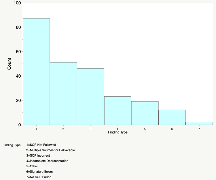 図2は、ビジネスプロセスの監査の結果を種類ごとに要約したパレート図の例になります。カテゴリの凡例が含まれているため、ラベルを長くしてカテゴリを読みやすくすることができます。