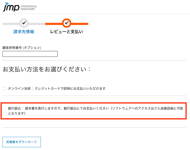 6. 通常のプロセスに従って、請求書のお支払いを進めてください。銀行口座情報は、お客様のJMPストアアカウント用に自動生成された固有の情報となりますのでご注意ください。過去の取引で使用したSASまたはJMPの銀行口座情報は、JMPストアでのオンライン注文にはご利用いただけません。JMPストアの銀行口座情報はお客様固有のものであり、今後のご注文でも変更されることなくご利用いただけます。