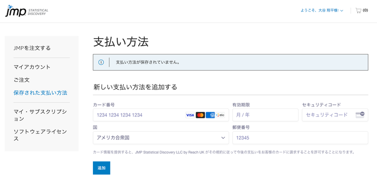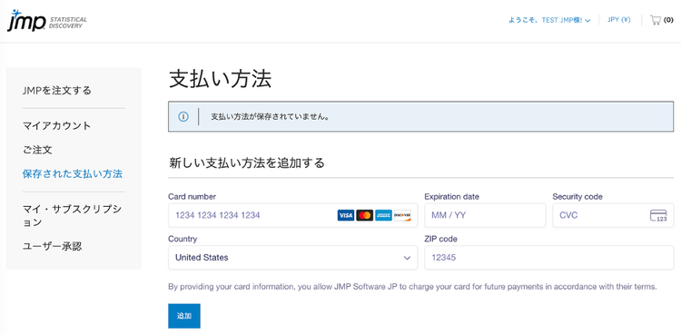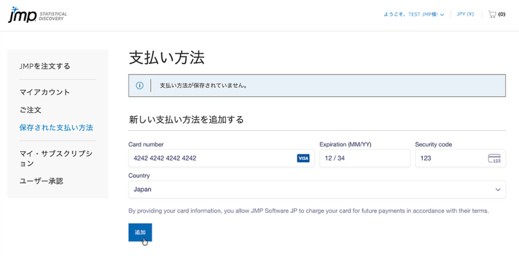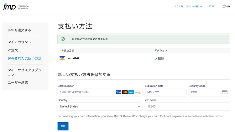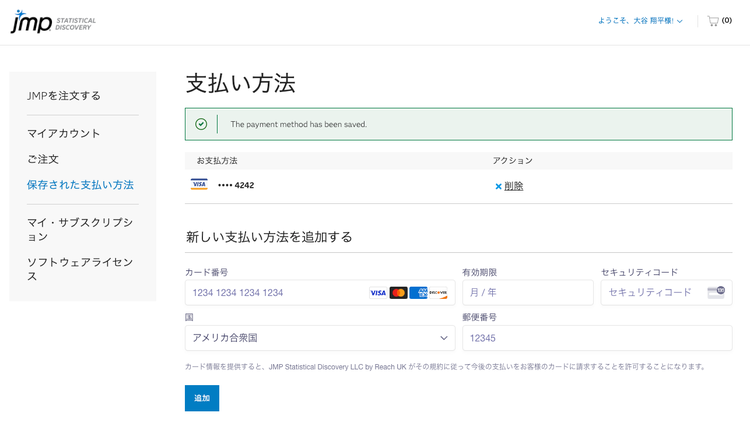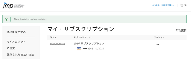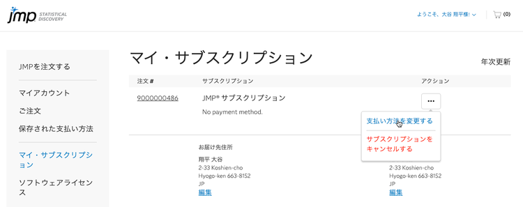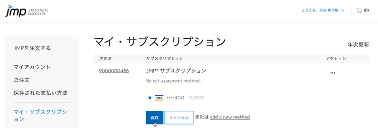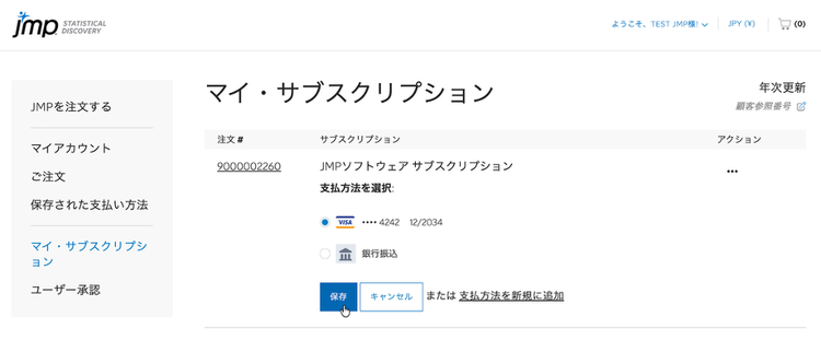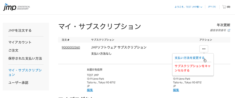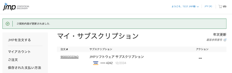新しく登録したお支払い方法は、JMPサブスクリプションの次回の更新時に使用されます。または、ライセンスを追加注文する際に選択できるようになります。