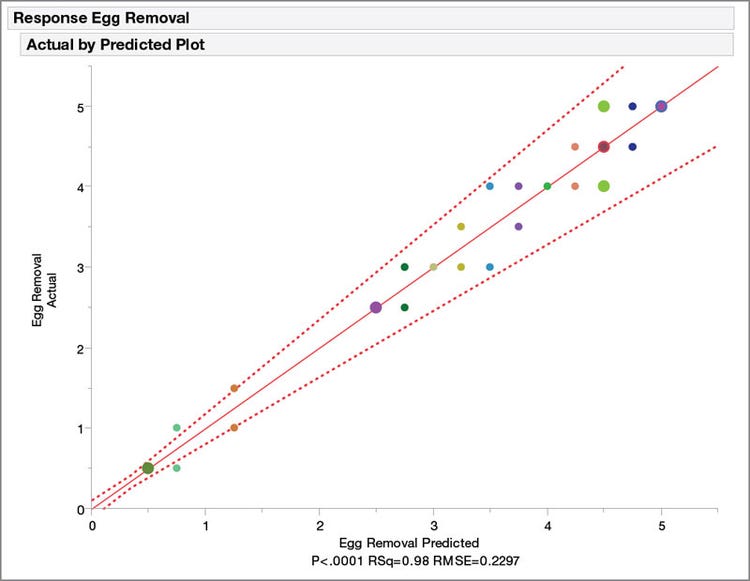 Dailey는 적절한 시너지 효과가 있는 구성을 파악한 후 JMP를 사용하여 비용을 최소화하면서 성과를 극대화했습니다. "JMP Profiler에 바람직성 함수를 적용함으로써 두 응답의 바람직성을 쉽게 최대화할 수 있었습니다."라고 그는 말합니다. "우리는 가장 낮은 비용으로 가장 좋은 계란 제거 방법을 찾았습니다."