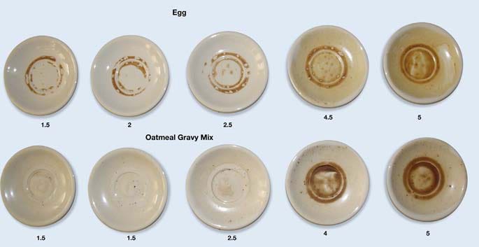 이 사진은 계란과 오트밀 침전물에 대한 평가 시스템의 예를 보여줍니다. 평가 시스템은 산업용 식기 세척기로 세척한 후 접시의 청결도를 판별하는 데 사용됩니다.