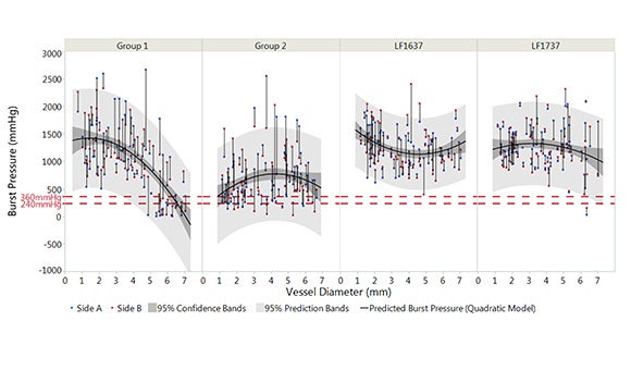 빠르고 효율적으로 다변량 분석을 처리할 수 있는 도구를 확보하게 되자, Pappas는 JMP®로 성능 데이터 분석을 자동화하는 특수 스크립 트를 만들었습니다. 이 응용 프로그램은 Seal Performance Tool이라 고 명명되었으며 연구 팀은 이 응용 프로그램으로 파열 압력을 다른 장치의 파라미터와 비교할 수 있습니다. 조직 효과 연구(Tissue Effect Research) 팀 전체가 이 도구를 사용하여 더 객관적으로 추세 및 전반 적인 신뢰도를 평가할 수 있게 되었습니다.