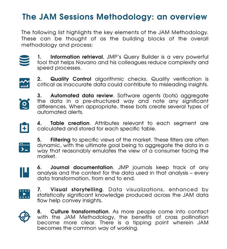 JAM 세션 방법론은 Navarro가 전략적 마케팅 및 비즈니스 인사이트를 얻을 수 있는 '발상의 전환'을 이루겠다는 분명한 목표 하에 전문가들 간 협업을 장려하기 위해 고안한 프로세스입니다. Navarro가 존경하는 잼 밴드와 마찬가지로, 이 프로세스는 다양한 도구를 사용하여 창의적이고 협업적인 사고를 통해 상업적인 성공을 이끌어내는 데 효과적인 솔루션을 찾기 위한 실험입니다. JAM 세션 방법론은 다양한 분야의 협력을 유도하고 저마다 다른 통계 기술 수준을 보유한 개인 간 의사소통을 촉진합니다.