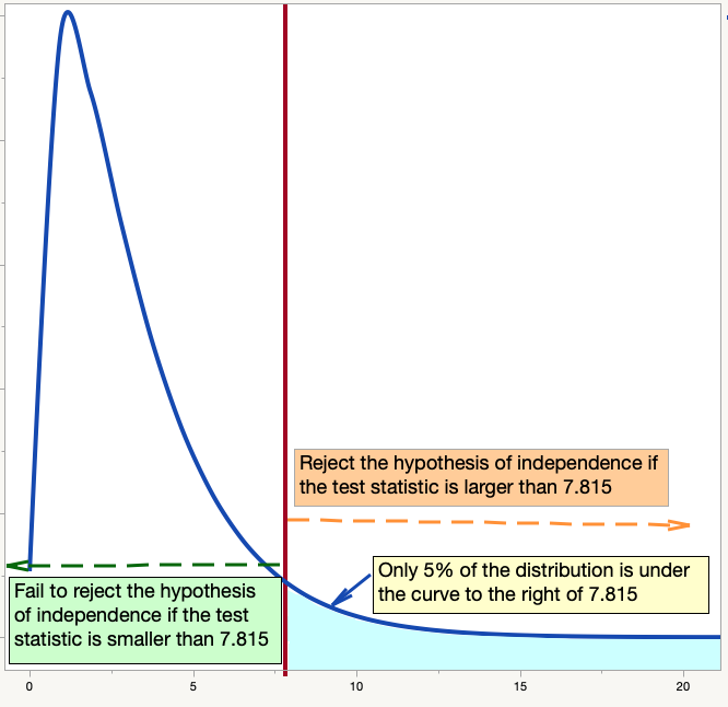 p 값을 더 정확히 탐색하기 위해 카이제곱 분포의 그래프를 사용해보겠습니다. 검정 통계량이 분포에서 임계값보다 극단값에 가까울지 여부를 확인하려고 합니다. 아래 그림은 자유도 3의 카이제곱 분포를 보여줍니다. 7.815이라는 값이 데이터의 95%를 "절단"하는 양상을 보여주고 있습니다. 자유도 3인 카이제곱 분포의 데이터 중 5%만이 7.815보다 큽니다.