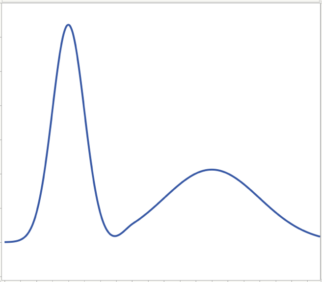 그림 6은 정규 분포가 아닌 분포를 나타냅니다. 여기에는 돌출점이 한 개가 아니라 두 개 있습니다. 돌출점이 두 개 있는 분포는 데이터에 서로 다른 그룹이 섞여 있음을 나타낼 수 있습니다. 예를 들어, 심박수는 일반적으로 정규 분포를 따릅니다. 하지만 여러분이 모르는 사이에 데이터에 운동선수와 활동적이지 않은 사람이라는 두 그룹의 안정시 심박수가 포함되었다고 가정해 보겠습니다. 이 경우 아래와 같은 양봉형 분포가 나타날 수 있습니다.