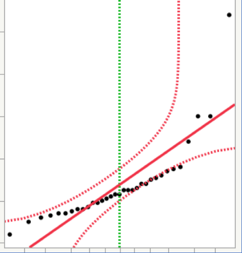 그림 11은 정규 분포를 따르지 않는 데이터를 나타냅니다. 데이터 값 중 일부는 빨간색 실선 근처에 있지만 대부분은 그렇지 않습니다. 일부 데이터 값은 빨간색 점선으로 표시된 신뢰도 경계 밖에 있습니다. 오른쪽 상단에는 극단값도 몇 개 있습니다.