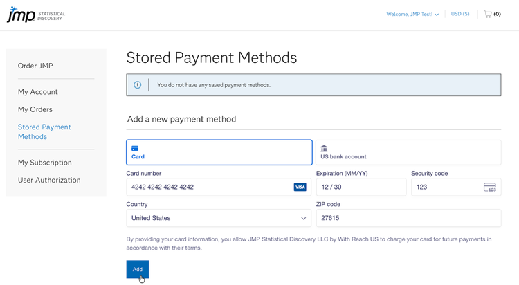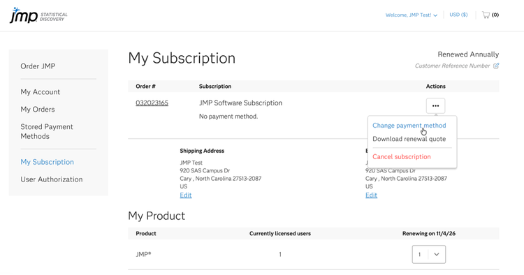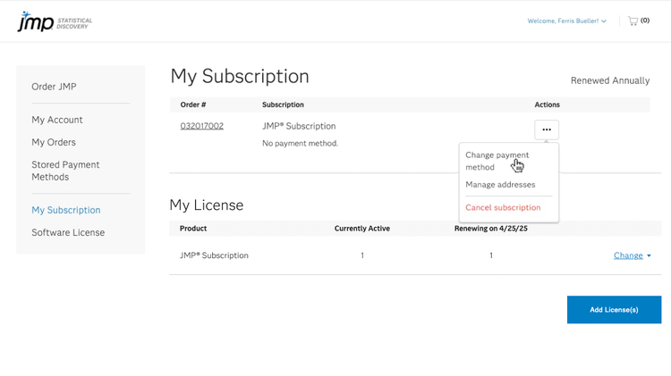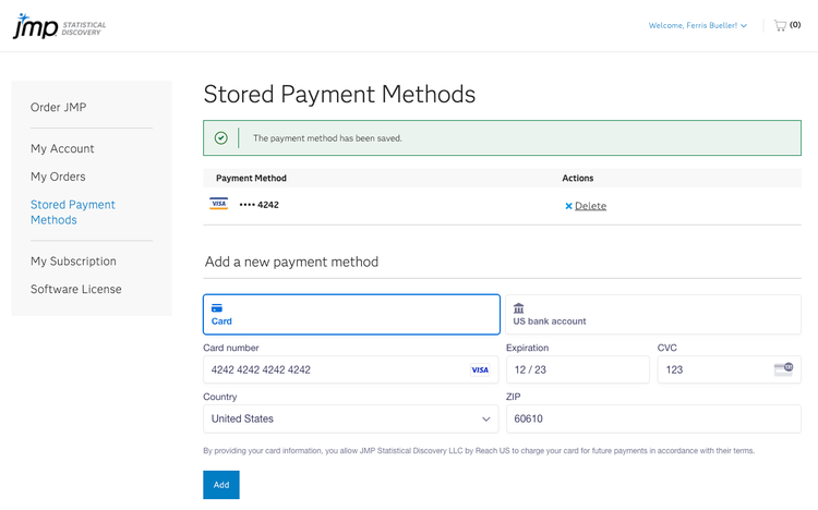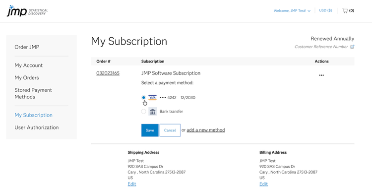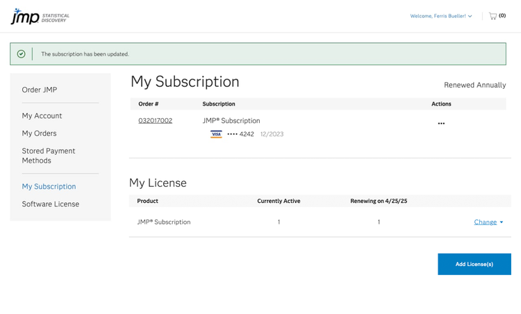 이제 새 결제 수단은 다음 JMP 구독 갱신 시 사용되며 추가 라이선스를 주문할 때 선택할 수 있습니다.