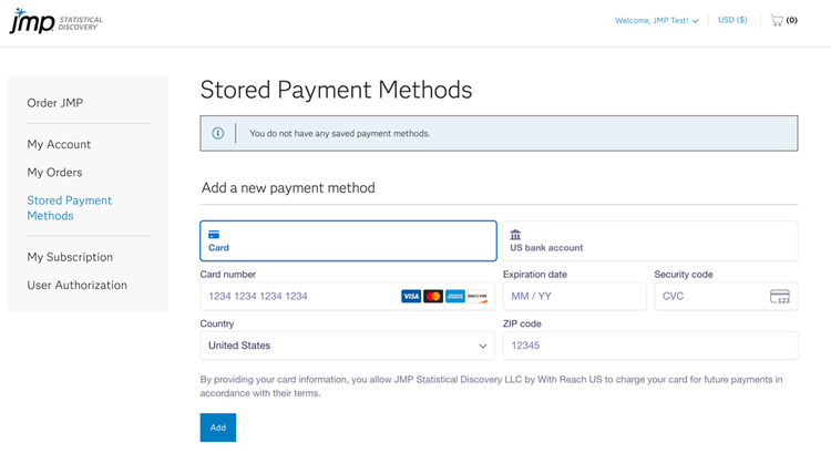 1. JMP Store의 저장된 결제 수단 페이지를 방문합니다.