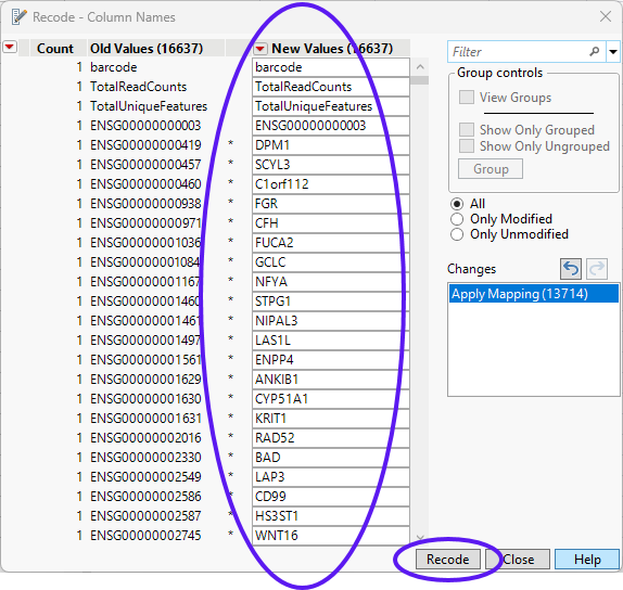 The values in the New Values column of the Recode - Column Names window are replaced with the gene 2 values. This recoding may take several minutes, depending on the size of your table.