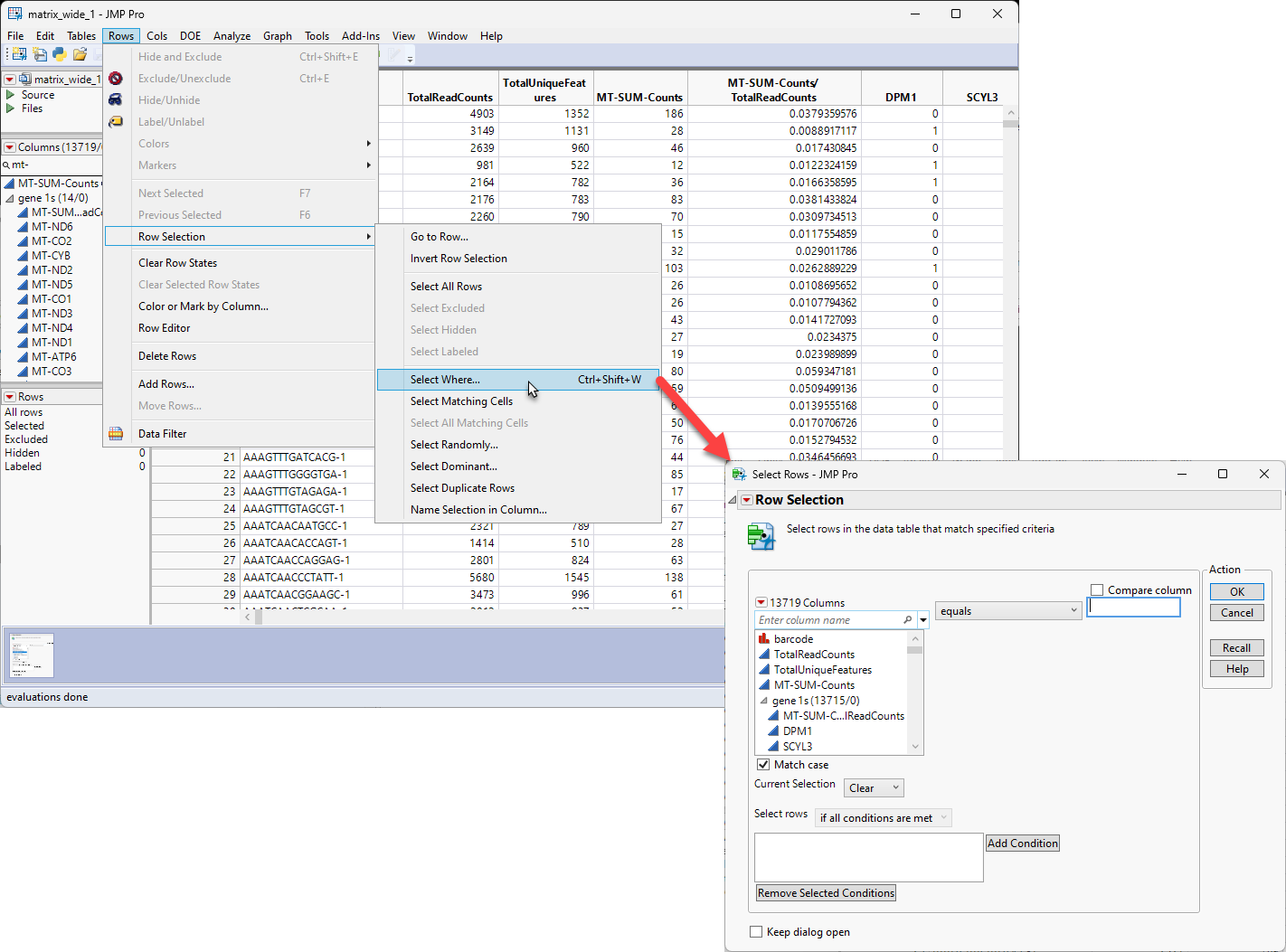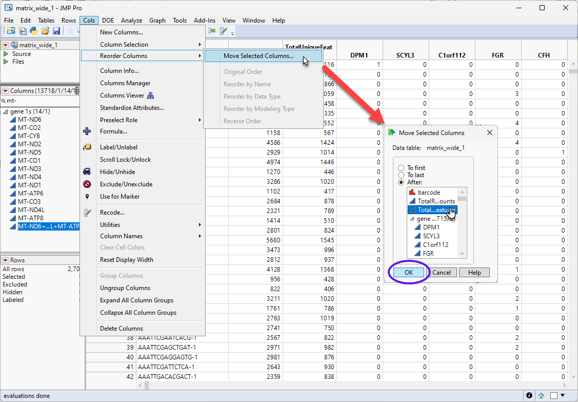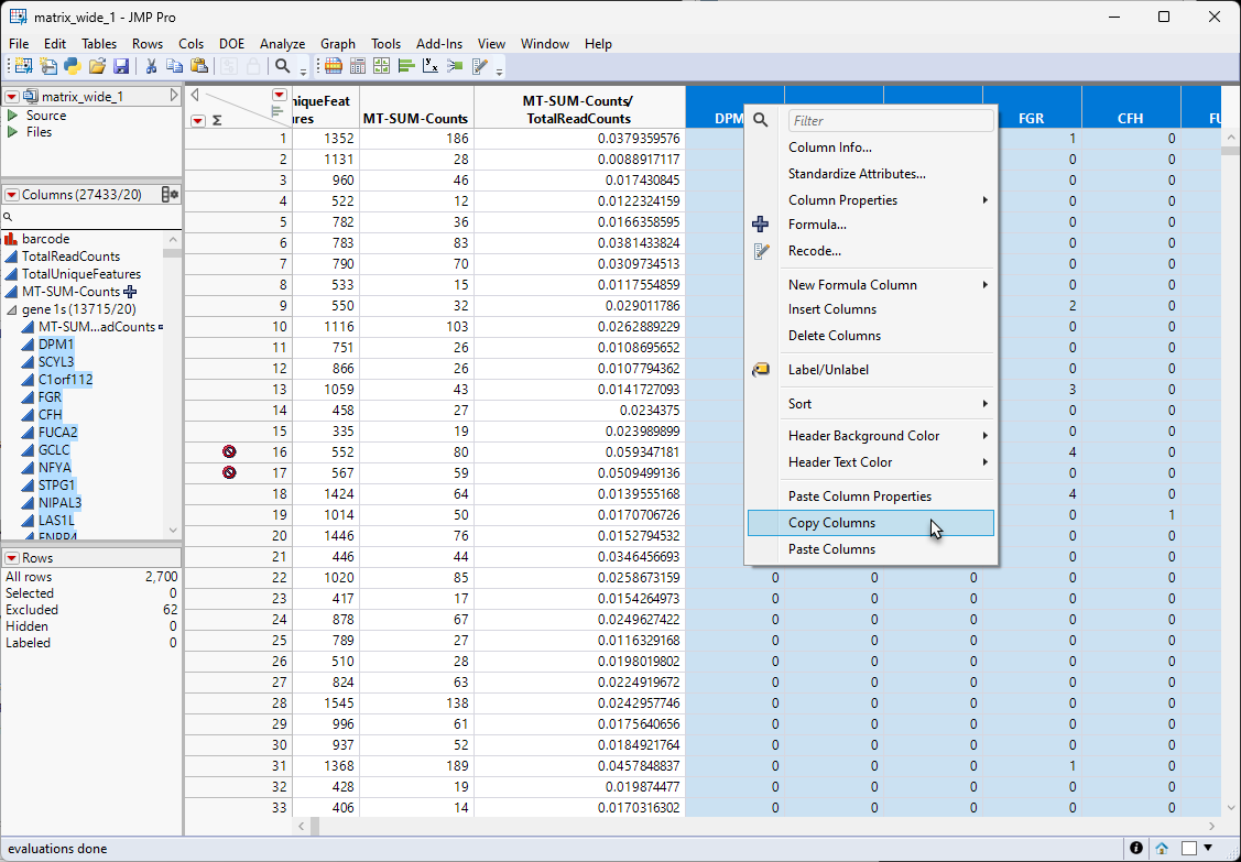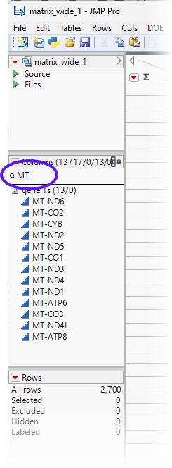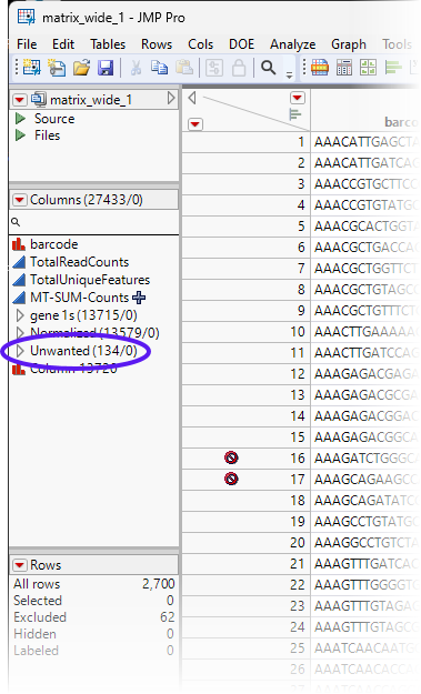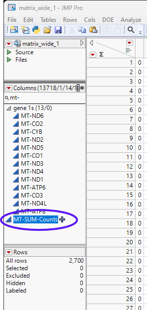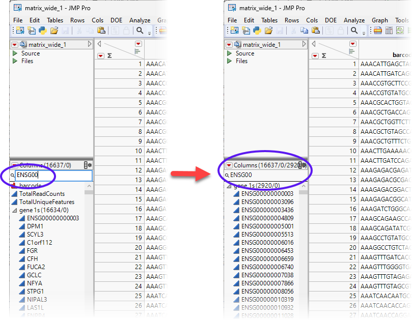 Note: Not all of the columns have been recoded. (See column 4, above) Recall that we filtered out all of the features in the genes.jmp table that occurred <3 times to generate the genes_1.jmp table. These genes either have all zeros across samples, or only expressed in a few cells, and thus are non-informative. These columns are still labeled with the ENSG00 Ensembl prefix. We use that prefix to remove these genes from the matrix_wide_1.jmp table.
