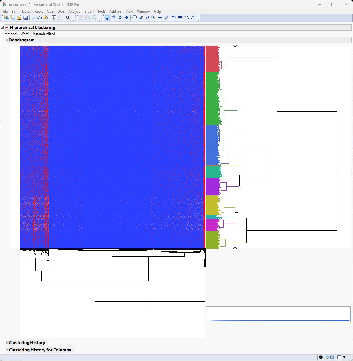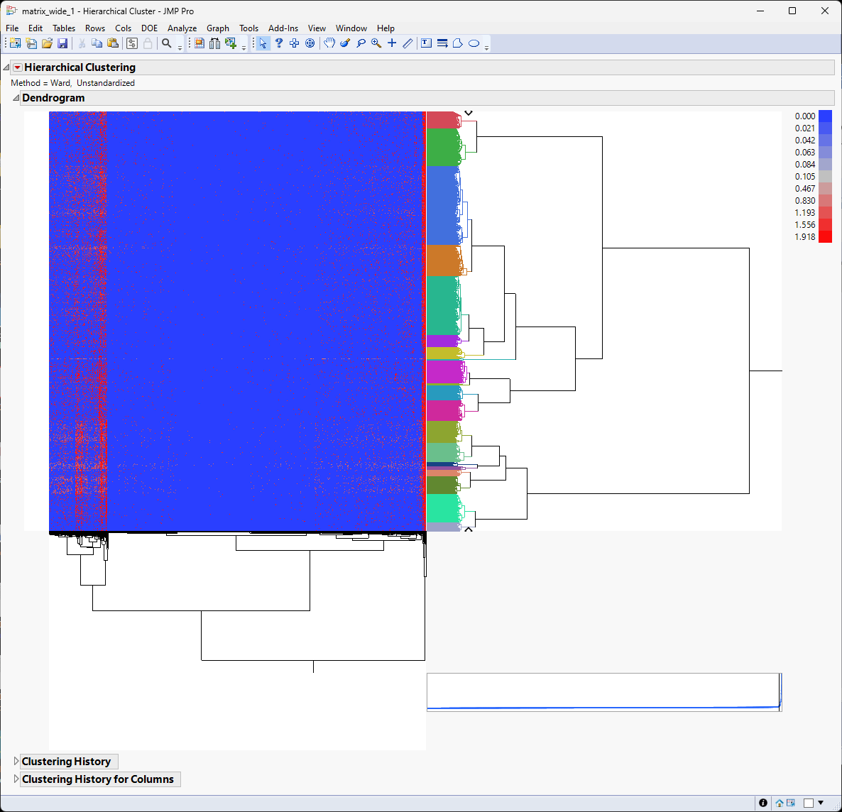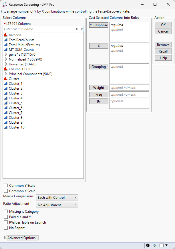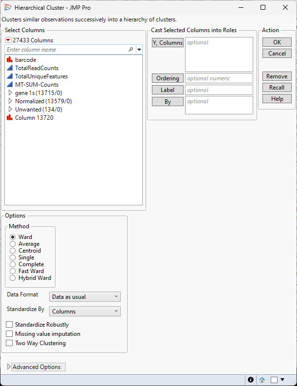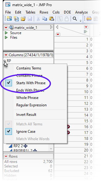 Note: Not all of the columns have been recoded. (See column 4, above) Recall that we filtered out all of the features in the genes.jmp table that occurred <3 times to generate the genes_1.jmp table. These genes either have all zeros across samples, or only expressed in a few cells, and thus are non-informative. These columns are still labeled with the ENSG00 Ensembl prefix. We use that prefix to remove these genes from the matrix_wide_1.jmp table.