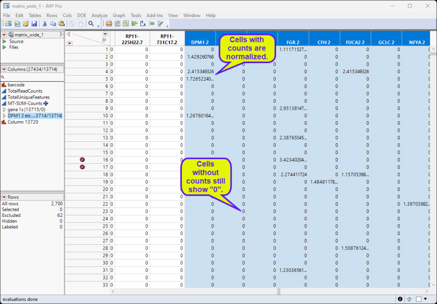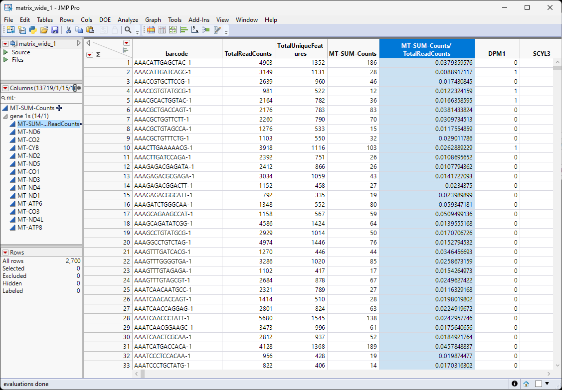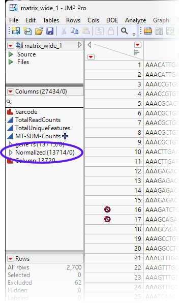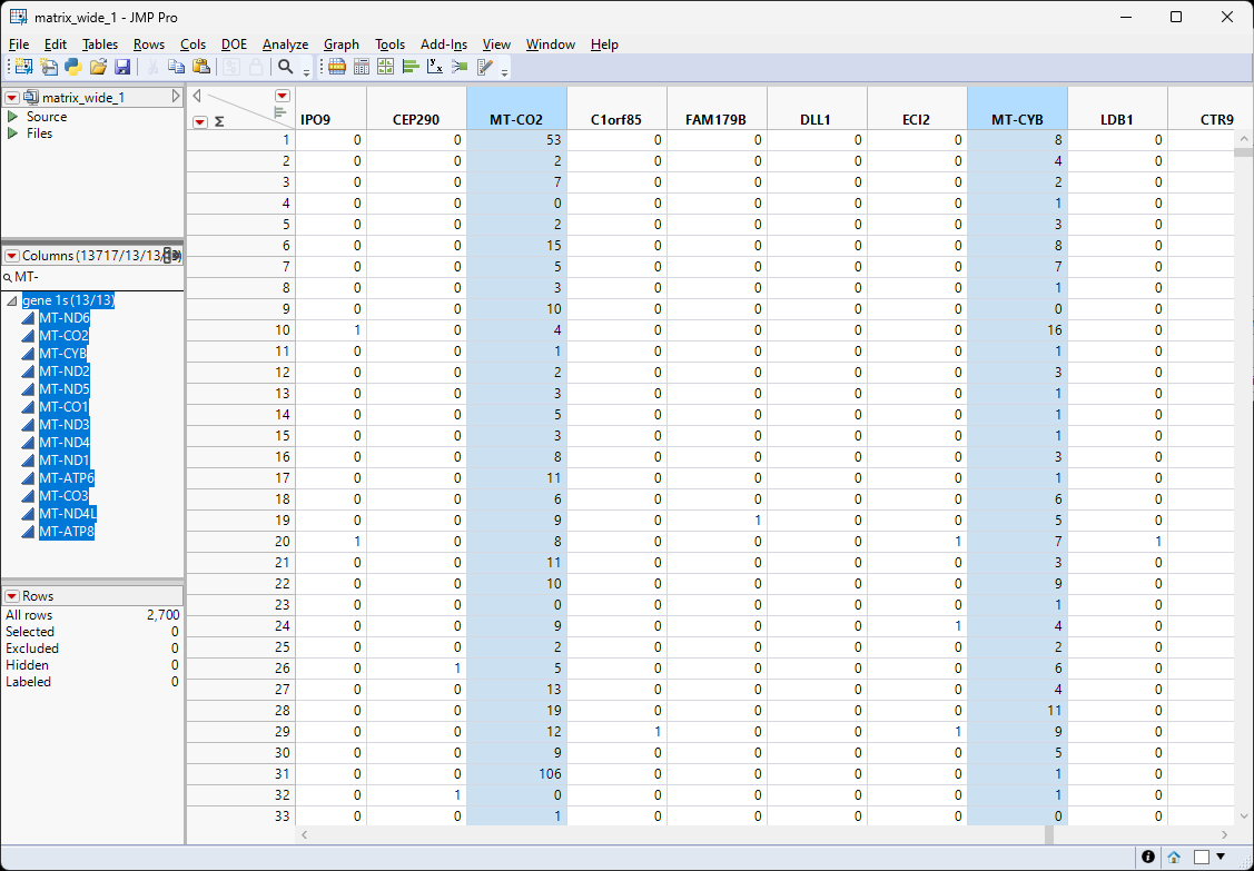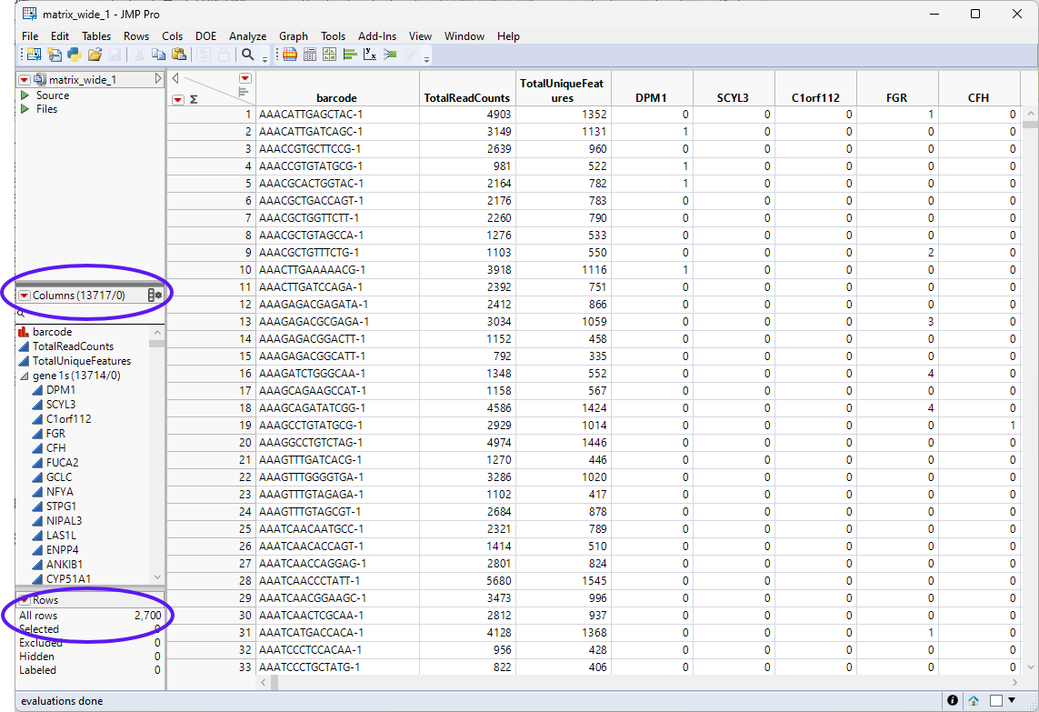 The matrix_wide.jmp table (below) is the data table and contains genes as the columns and barcodes (cell IDs) as the rows.