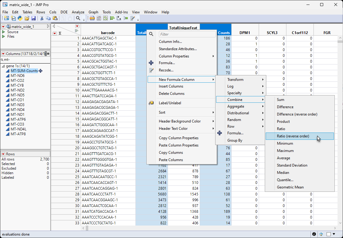 | 8 | Select both the TotalReadCounts and the MT-Sum-Counts columns. Right-click on one of the column names and select New Column Formula > Combine . Ratio (reverse order). |