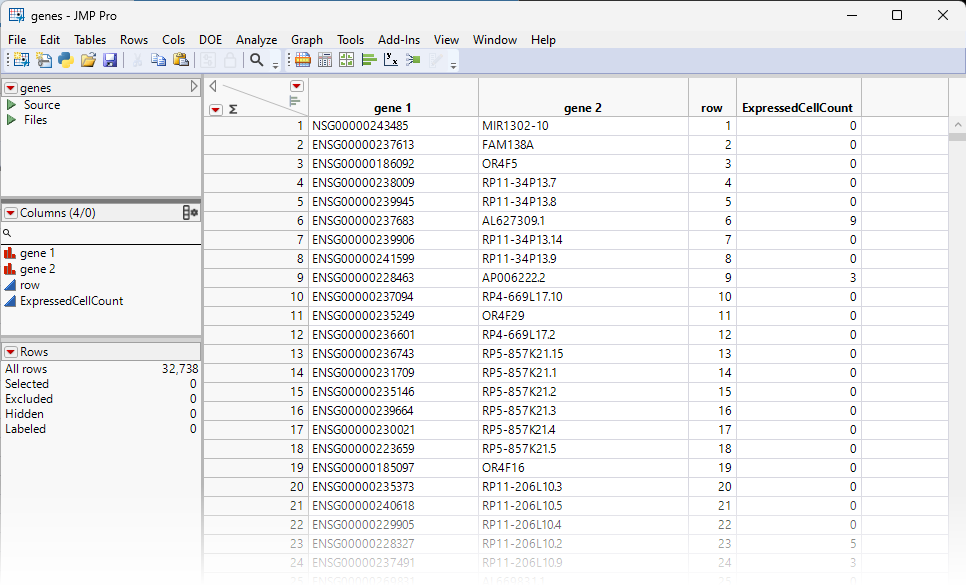 The genes.jmp table contains gene-specific information, such as gene annotation, gene length, pathway information, etc. In the importation step, we also summarize the number of expressed cells for each gene, and name it 'ExpressedCellCount'. For this example, the genes.jmp table contains the row labels of the sparse matrix (gene 2), representing the names of all the genes in the study.
