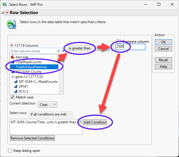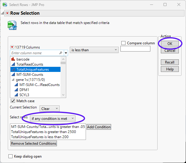Often, in single cell experiments, samples with total unique features that are either too high or too low or possess very high percentages of mitochondrial sequences have been found to be unreliable sources of biological information. To remove these samples from the analysis, JMP Pro enables you to filter out those samples. In this example, we filter out any samples that satisfy the following conditions: