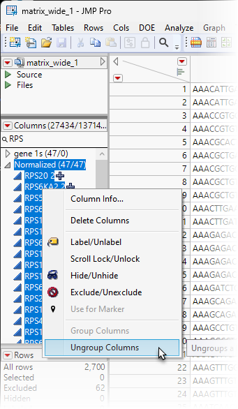 | 8 | Press the CTRL key and highlight all of the genes in the Normalized group.. Right-click and select Ungroup Columns to remove these columns from the Normalized group. |