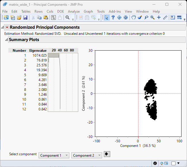 For genomic data, which typically have a very large number of variables, the Principal Components platform provides an estimation method called the Wide method. The Wide method enables you to calculate principal components in short computing times.